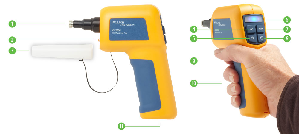 1、可更換式探尖支持一或兩排 8、12 或 16 UPC 或 APC 連接器以及單光纖*
