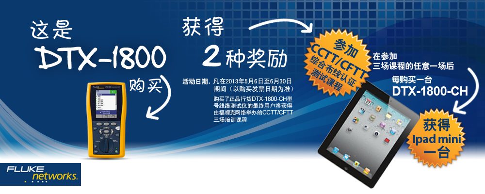 凡是在2013年5月6日至6月30日期間(以購(gòu)買(mǎi)發(fā)票日期為準(zhǔn))從福祿克網(wǎng)絡(luò)(中國(guó))合法經(jīng)銷(xiāo)商處購(gòu)買(mǎi)正品行貨DTX-1800-CH 線(xiàn)纜認(rèn)證測(cè)試分析儀(限前100臺(tái))的客戶(hù)將獲得2種獎(jiǎng)勵(lì):